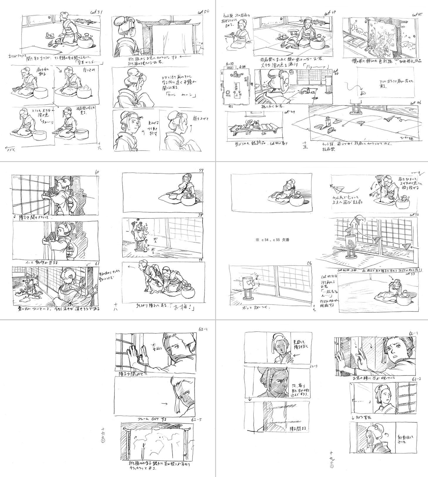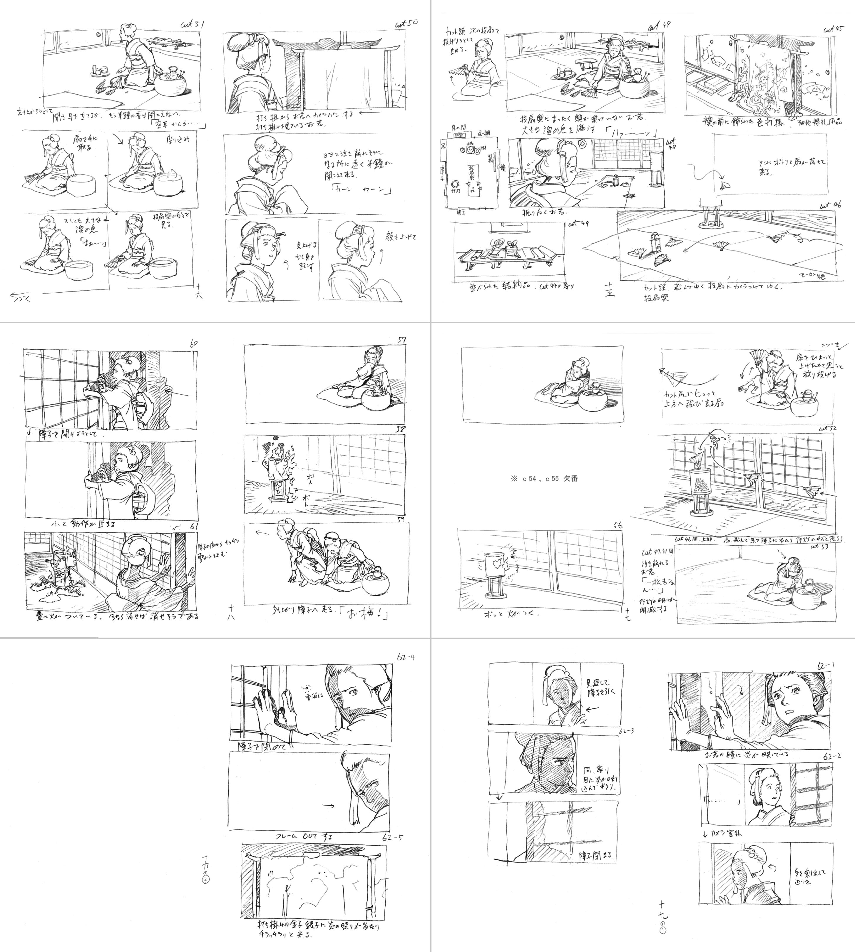 Those storyboards would turn out very differently from Steamboy’s or Cannon Fodder’s or Akira’s. Gone was the vertical, paneled template used in so many anime productions. The way it’s drawn is strange, too. Otomo’s sketches are gorgeous, but they almost don’t feel like storyboards — there’s a subtlety and stillness to them, and they’re scattered across each page at random sizes.
