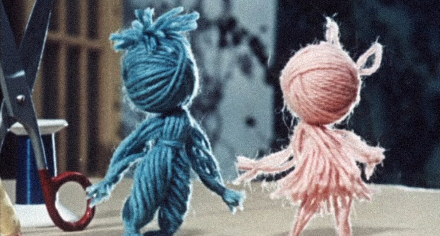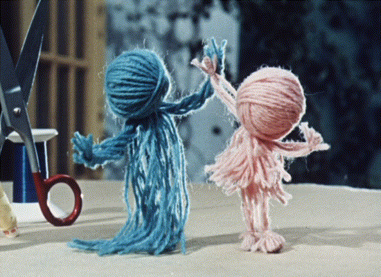 Her first major attempt with it was Two Balls of Wool (1962).4 There, the contents of a sewing kit come to life. A pincushion becomes a horse; a tape measure becomes a snake. Týrlová noted that her goal with the film was “to animate only things, with no puppets” (emphasis added). Its heroes are balls of yarn that morph themselves into doll-like shapes — and then cause trouble.