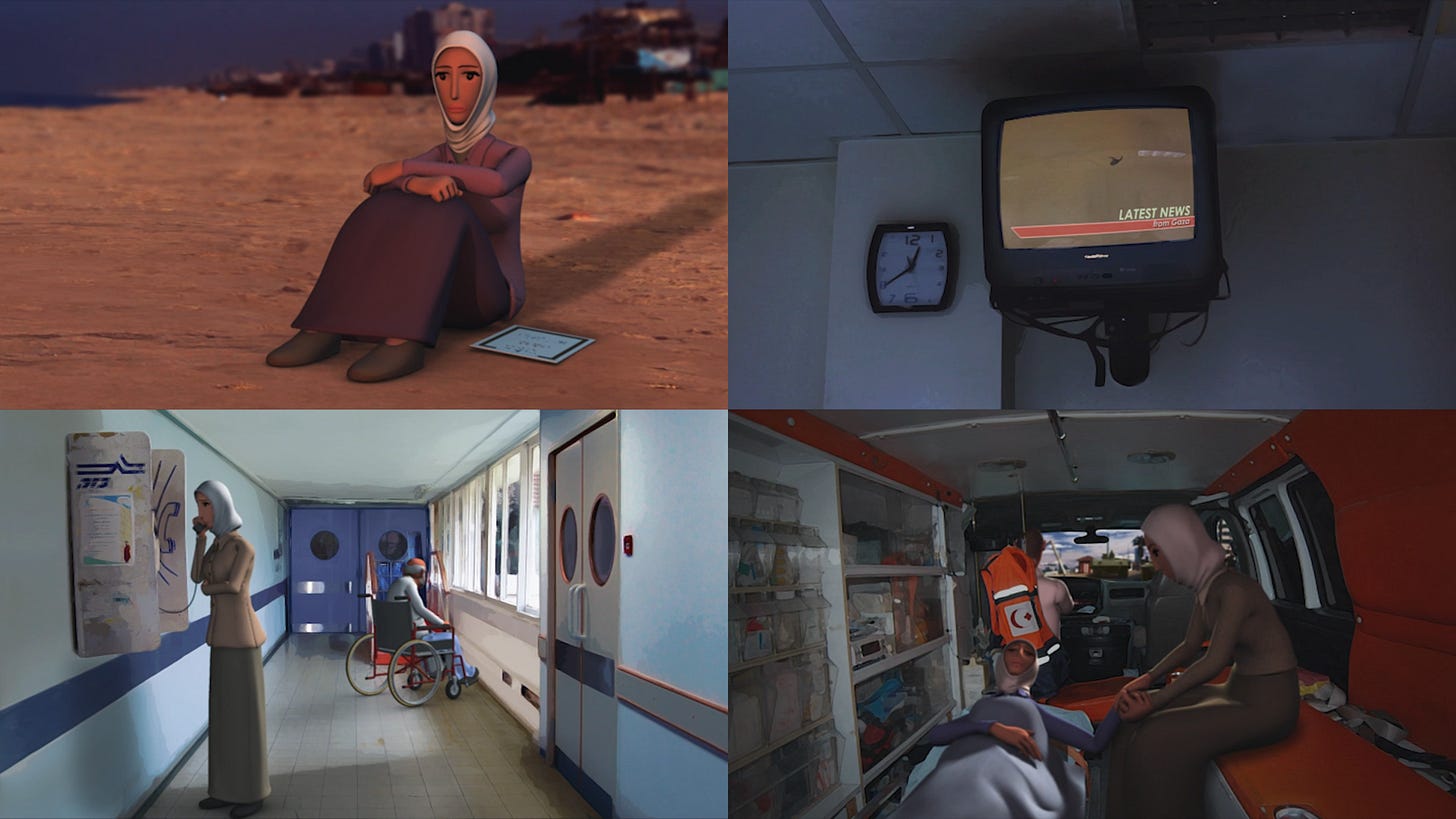The production’s rawness adds to this general sense of desperate authenticity. Fatenah’s characters are basic 3D models, and they walk around in a mashed-up world of photos, 3D assets and video footage. The team did what it could with what it had — around $60,000, mostly invested by WHO. The conditions in the West Bank were tough, the crew small. Fatenah’s director, Ahmad Habash, was its sole animator.