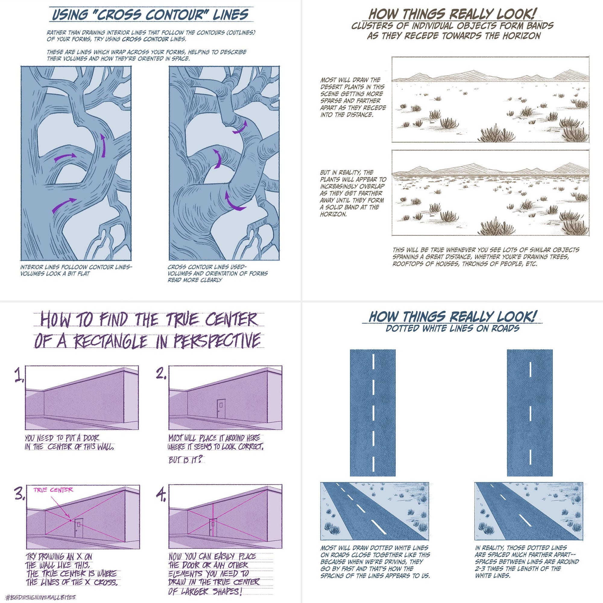 These posts are scattered around his accounts on Instagram, Facebook, Twitter and Tumblr. For example, check out the ones on a “simpler approach to drawing cylinders,” on “disorder and randomness” and on finding the “true center of a rectangle in perspective.” The list goes on.