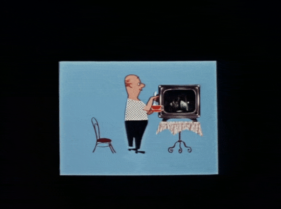 In The Story of a Crime, we looked for details, more lapidary movement — what is now called limited animation, which all the more requires such spontaneous details: [protagonist] Vasily Vasilyevich approaches the TV and sits down with a cup of tea. But before he sits down, he looks back for a moment at the chair he is about to sit down on. This is not done in the style of classical animation and lacks the usual multitude of particularities, which in this case are simply cut off ... But this detail is very important. It colors the scene. After all, there was nothing in the frame; it was empty. And this detail fills in the empty space, puts everything in its place. The rest is up to the viewer to complete.