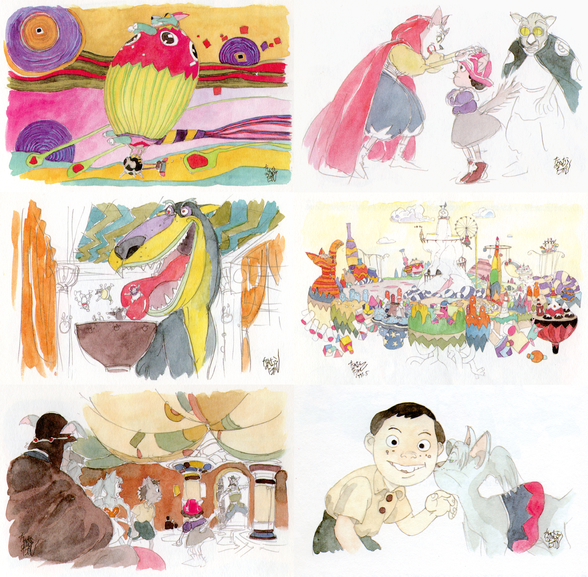 His concept sketches for Catnapped are dated as early as 1992, and they reveal how far he’d drifted from Akira. This artwork is bright, circus-like, psychedelic. And the characters are simplified, pushing back against the realism of Akira with cartooniness.