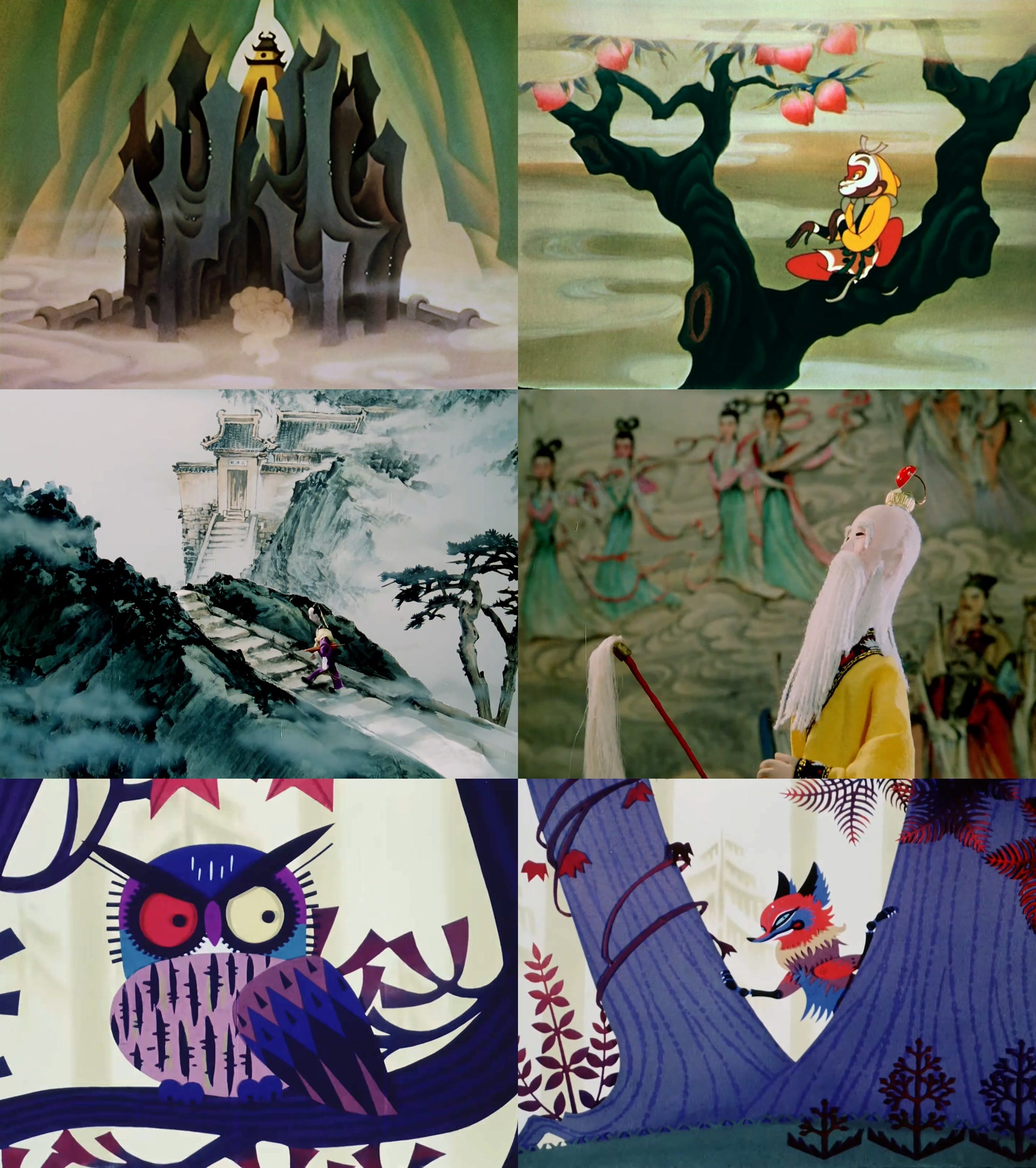 Or take Uproar in Heaven, a feature made in the first half of the ‘60s. Its story comes from Journey to the West, and much of its styling from Peking opera. But there was more: “folk prints” of Sun Wukong, “Chinese New Year paintings” of Nezha, the Yongle Palace murals, monkey kung fu.10 As animator Pu Jiaxiang remembered: