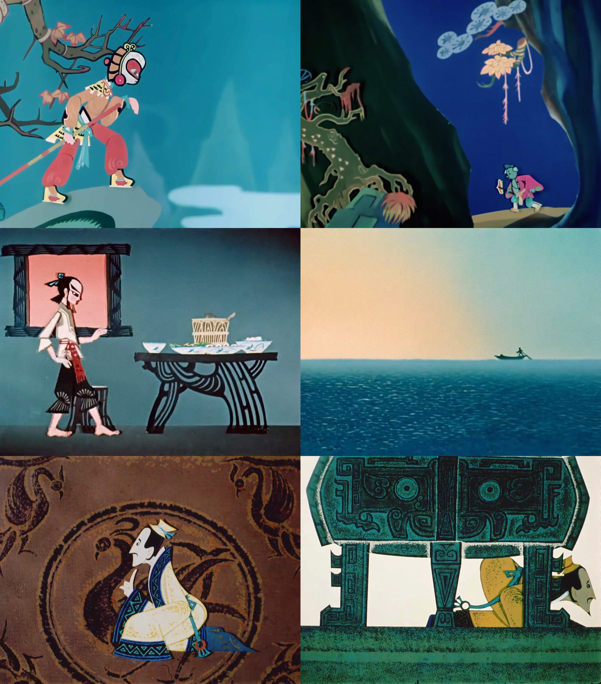 In those days, Chinese animation was often called meishu dianying — literally, “art films.” That mattered for reasons beyond semantics. “As the name implies, an art film is both art and film,” explained a screenwriter at the studio.3 The Shanghai team began to treat its projects as film adaptations of arts and crafts, guided (in the storytelling, staging, movement and more) by the idiosyncrasies of each form.
