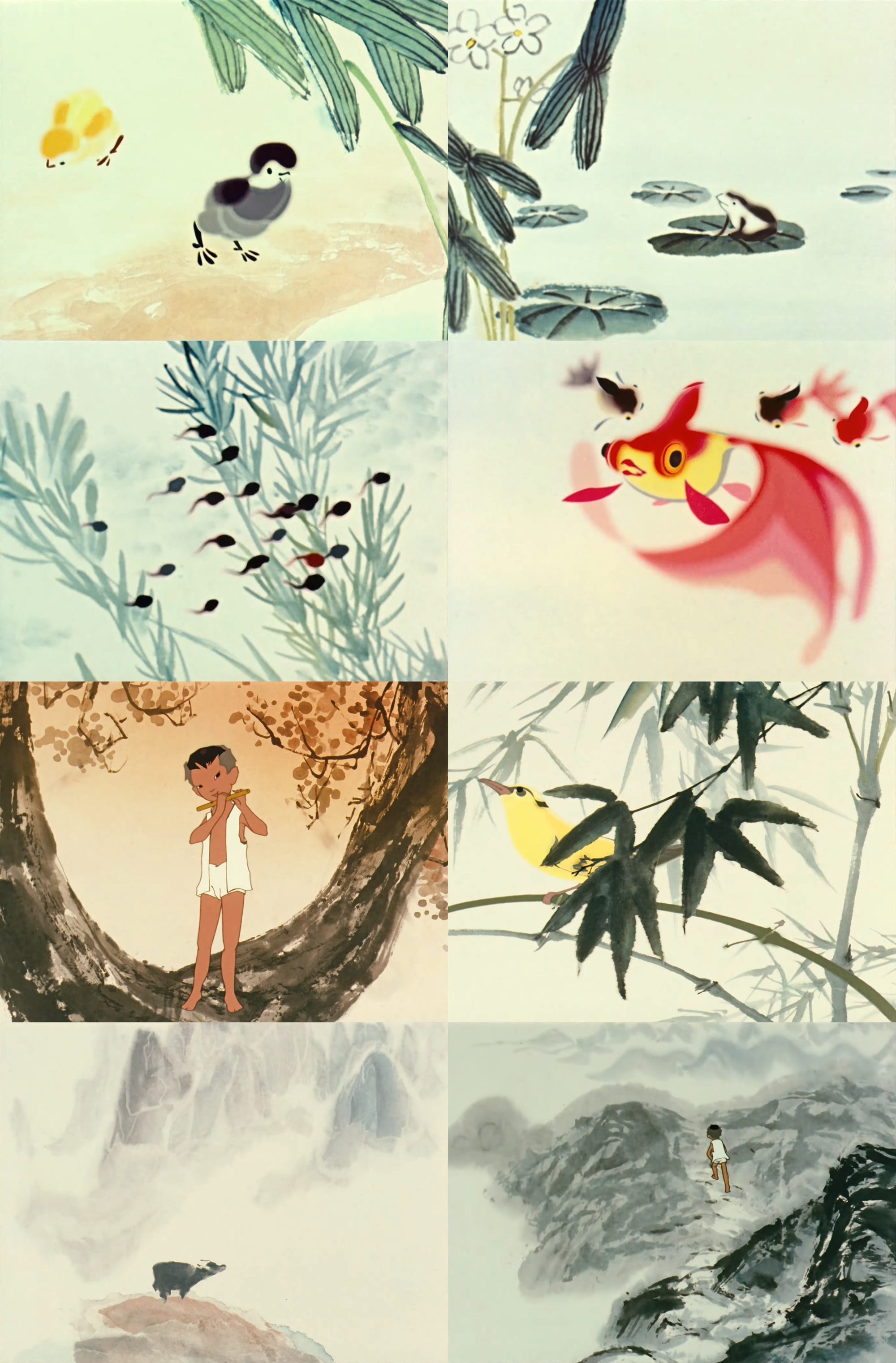 For the Shanghai team, even specific genres of ink-wash painting called for specific solutions. Tang Cheng described their first effort, Little Tadpoles Search for Mama (1960), as an instance of “bird-and-flower” art in the vein of painter Qi Baishi. But she wrote that the 1963 Buffalo Boy and His Flute was “landscape painting plus figure painting.” Recreating that on film was a far more complicated task.