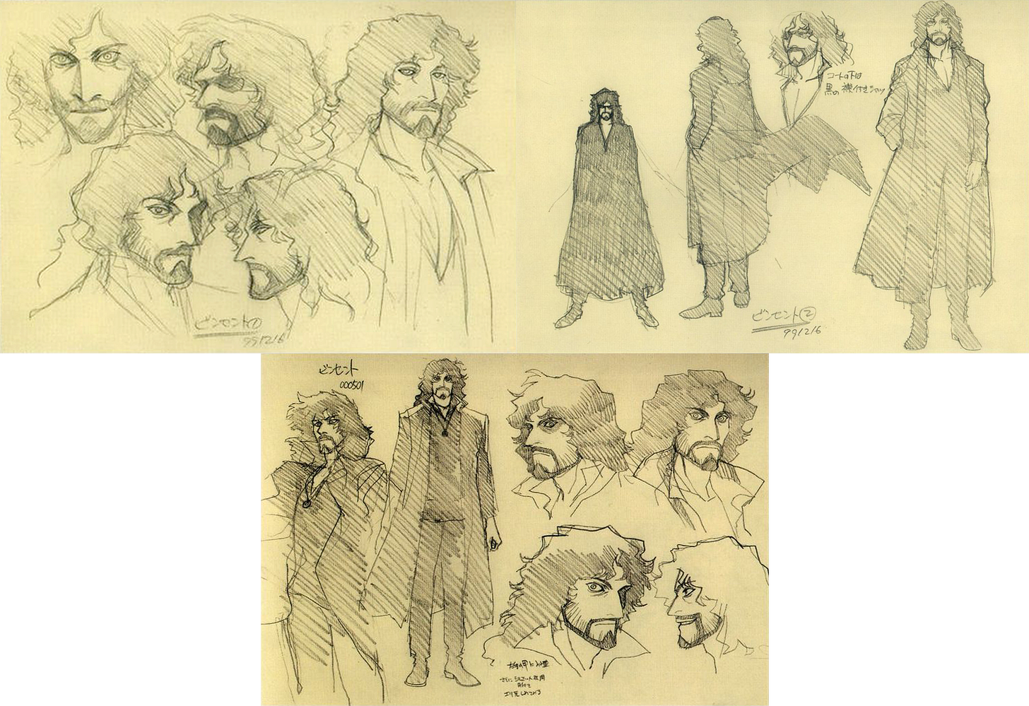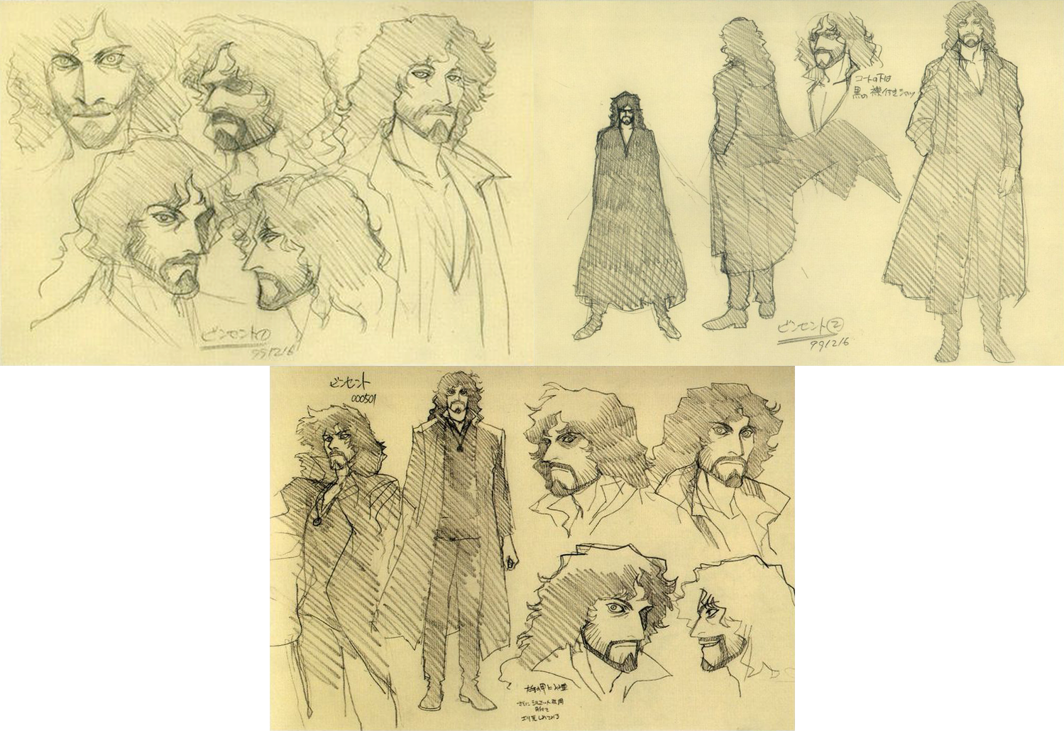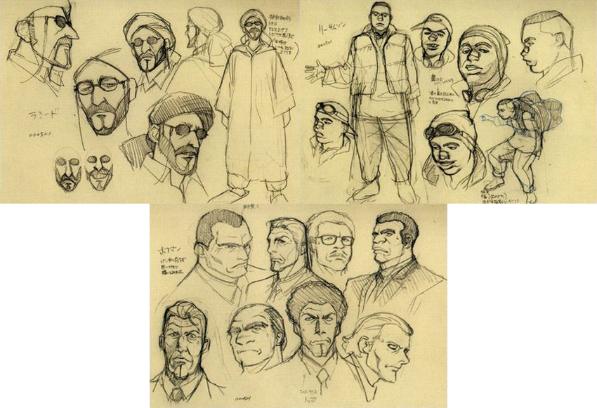 Kawamoto was set loose on the characters once again. By this point, the tone and style of Cowboy Bebop were in place — he knew how to get finished designs with fewer revisions. His initial sketches for the film often look similar to the final characters. The main issue was, again, consistency.