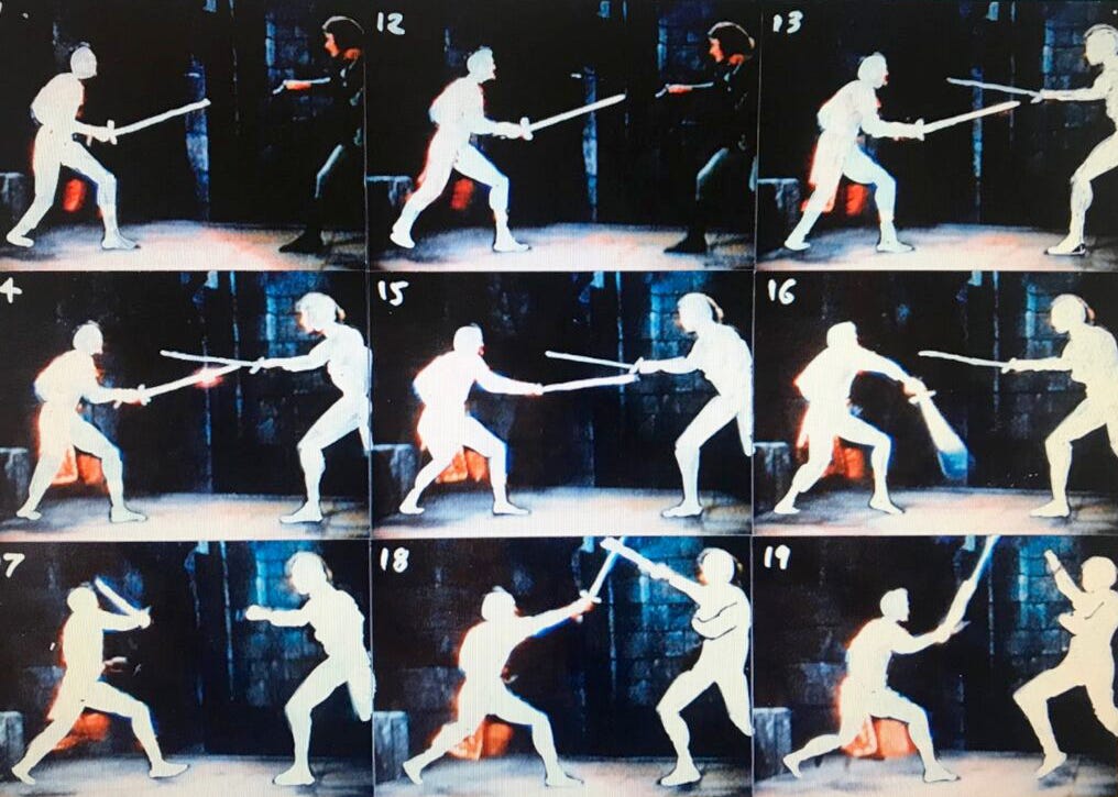 … the camera angle has them [fighting] in exact profile. This was a godsend. I did my VHS/one-hour-photo rotoscope procedure, spread two-dozen snapshots out on the floor of the office and spent days poring over them trying to figure out what exactly was going on in that duel, how to conceptualize it into a repeatable pattern.
