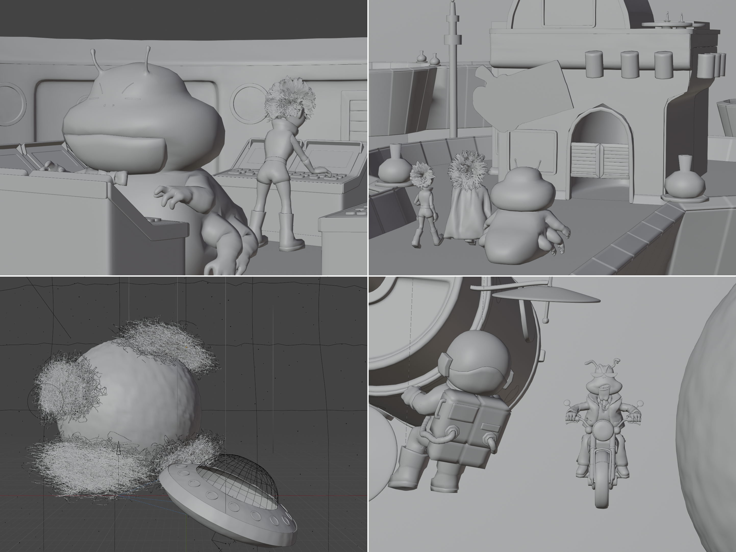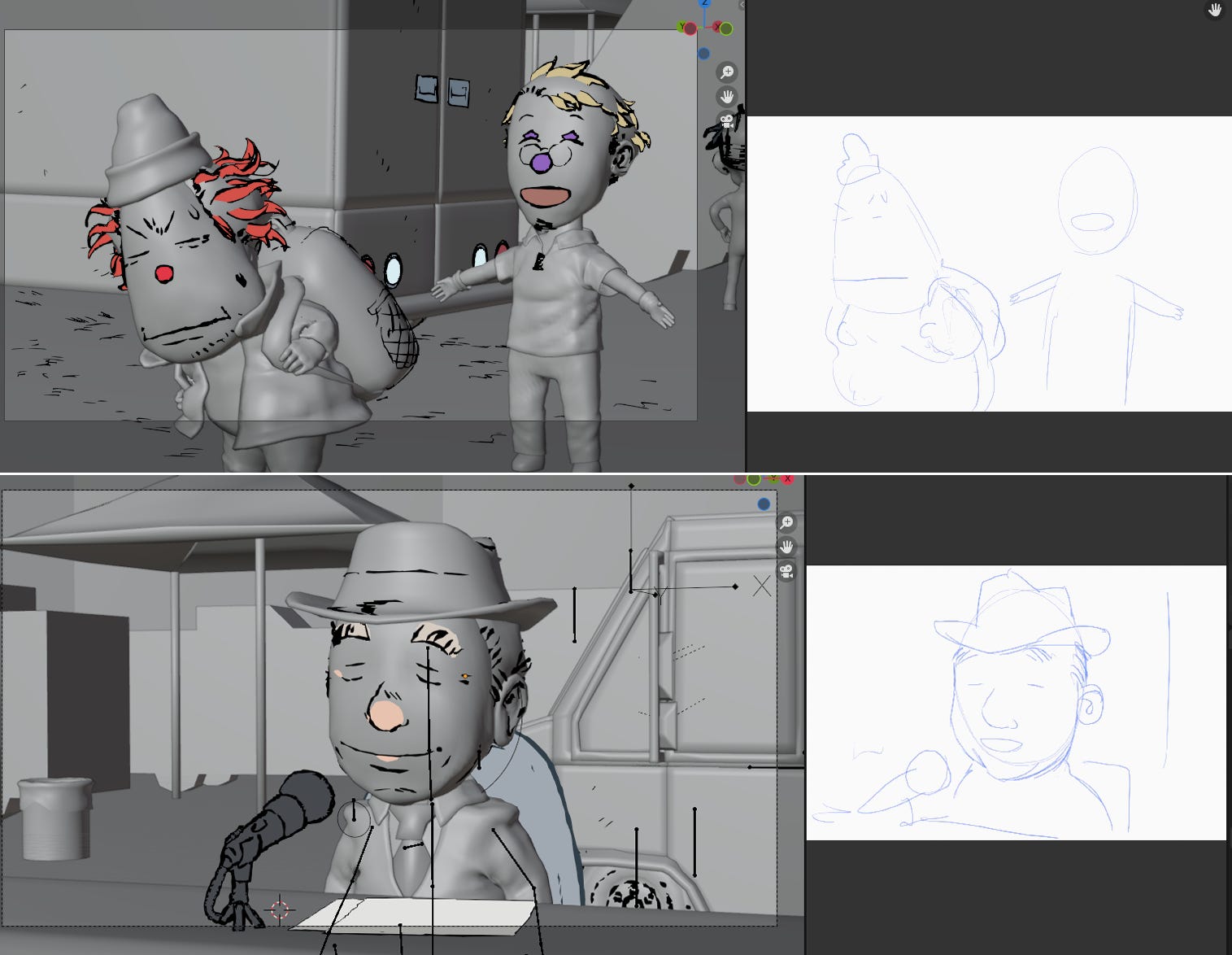 Next is character animation. Each character is an individual Grease Pencil object so I can translate them around if I need to. Each shot is its own Blend file, with the materials linked between them.