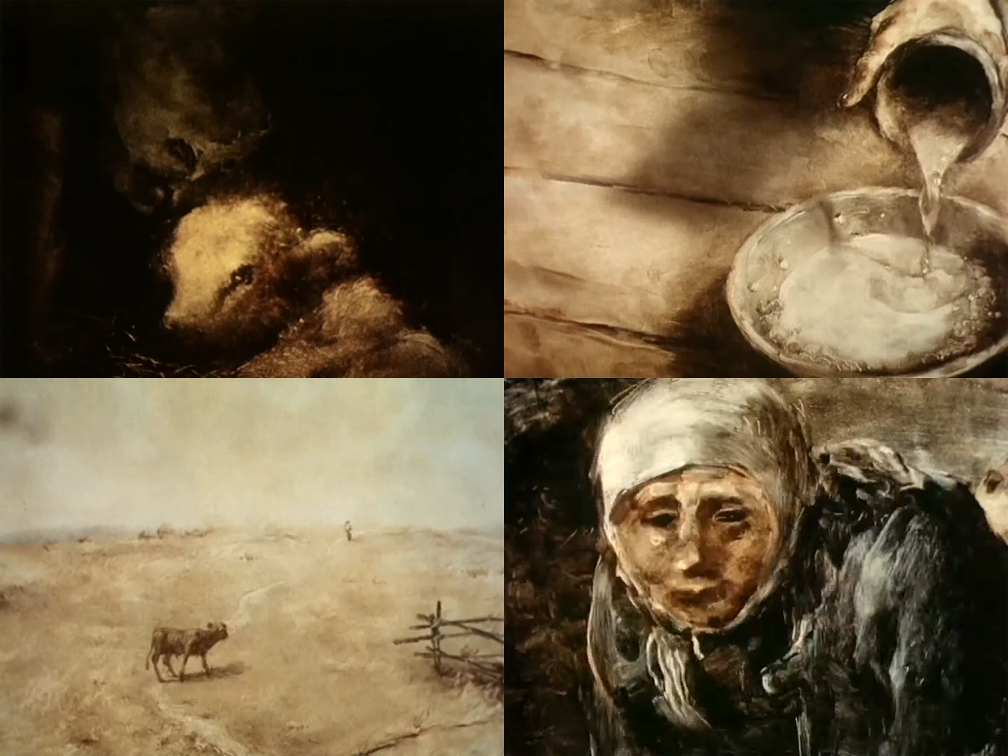 Director-animator Alexander Petrov took from Rembrandt for The Cow, but not only him. As a painter, Petrov has acknowledged his love for Socialist Realism: the much-derided official Soviet style. “My teachers were realist painters,” he said in 2008, “who created things perceived today with a fair amount of irony and cynicism. Nevertheless, they created it sincerely. They were seeking harmony in painting.”2