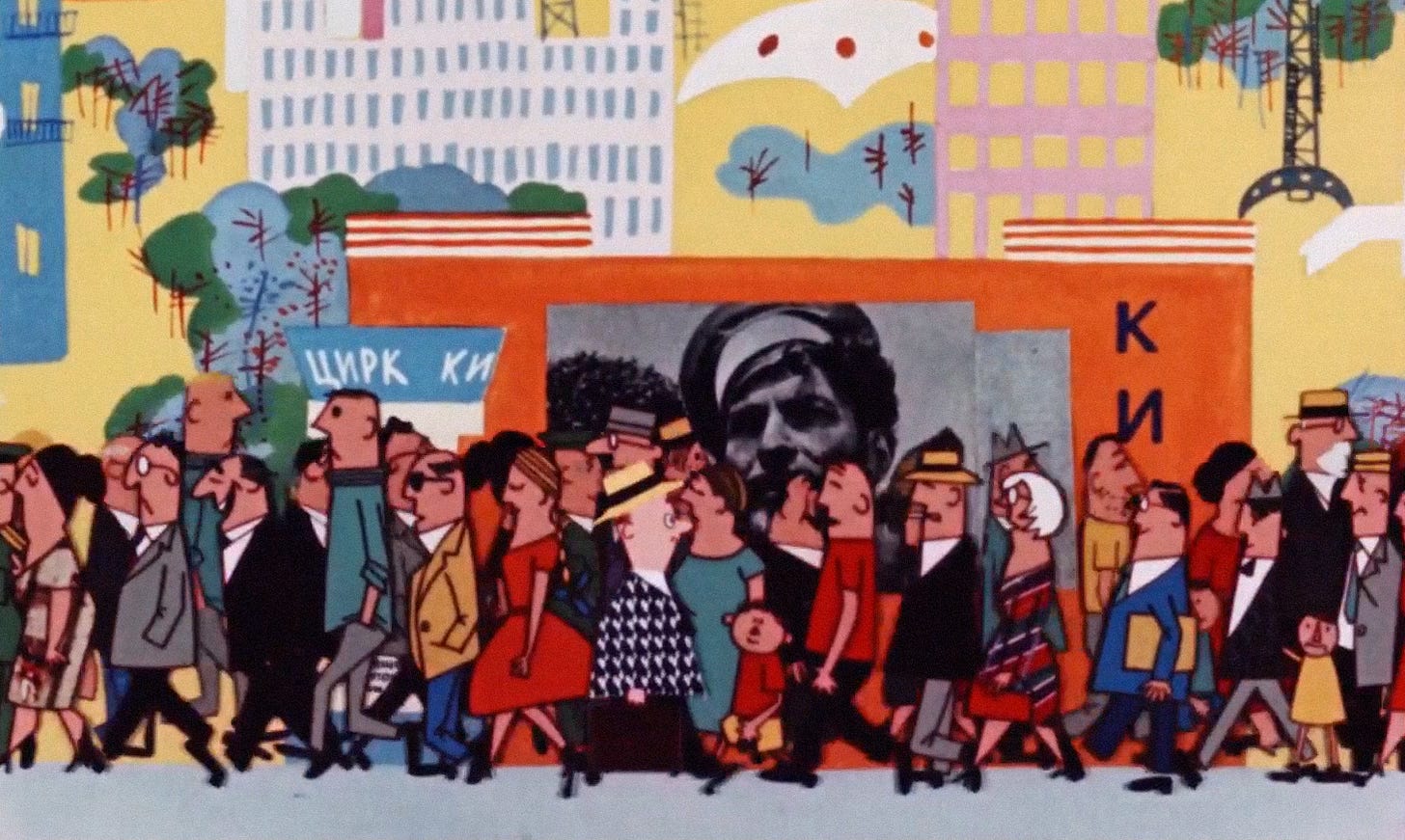 One example we looked at was Fyodor Khitruk’s debut film: The Story of a Crime (1962), which reduces many actions to just two poses. The short helped to spark a revolution against Socialist Realism in cartoons, a move toward mid-century modern graphics and “limited animation.” We were surprised to learn that Khitruk attributed his switch to the influence of Czech animation — rather than UPA or Zagreb Film.