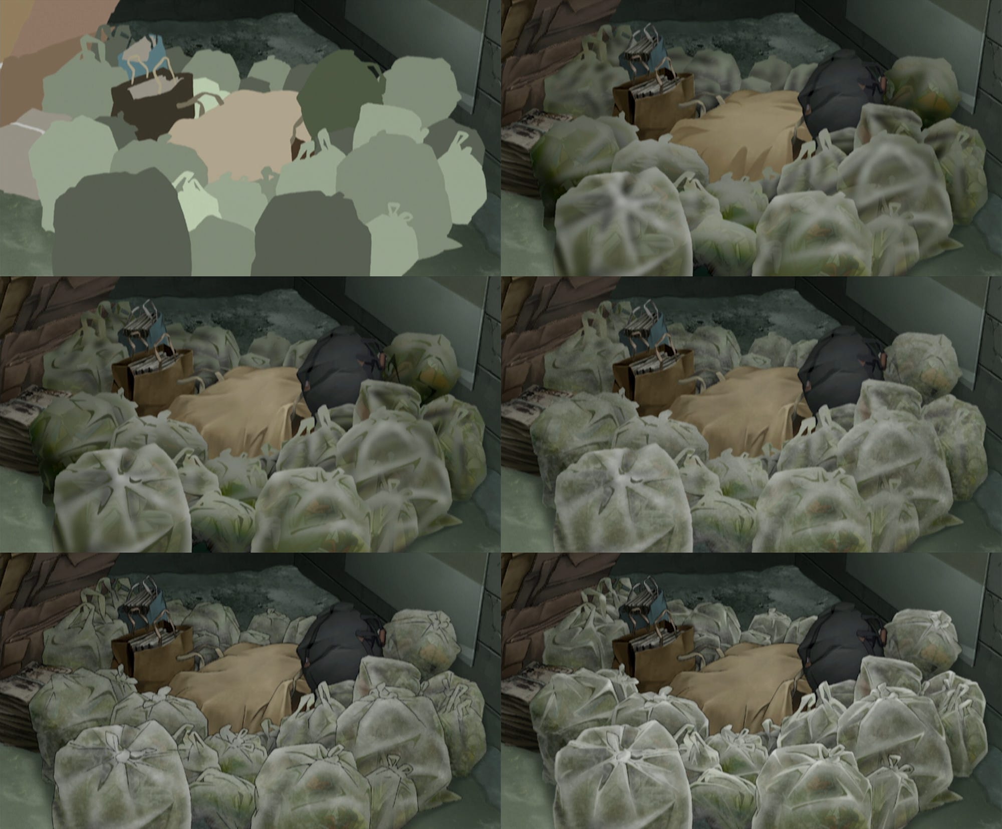 Most of the look of the garbage came about through “harmony processing,” a Japanese industry term. It refers to a way of mixing background paintings with cel overlays to create a unified image — something that has the lines of a moving object, but the texture of a background object. You know it when you see it. They used it for the bags, but also for an unusually large amount of other background stuff in Tokyo Godfathers.