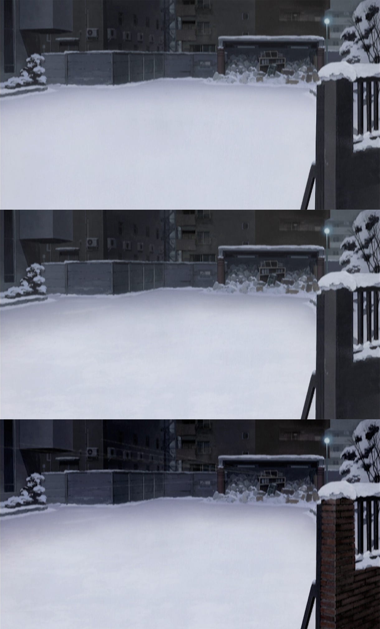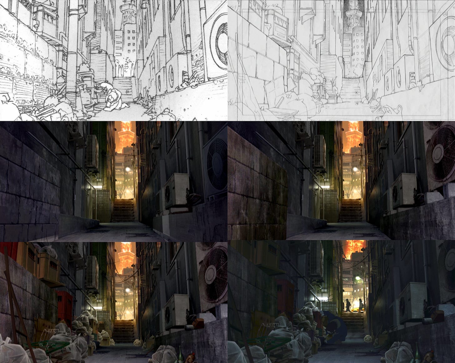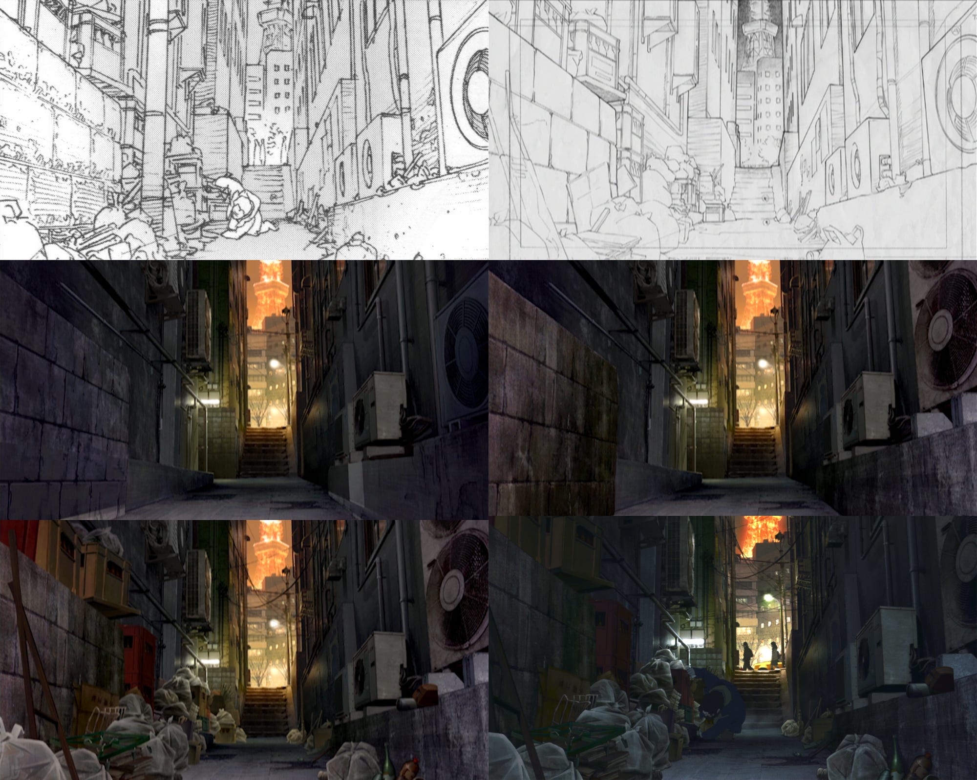 In fact, Kon saw it as fatal to copy the photographs too closely, even for locations based on real ones. The artists risked falling “into a labyrinth of details without grasping the essential composition and structure of the object.” The photorealism in Tokyo Godfathers was always added after a clear, simple, solid blueprint was in place.