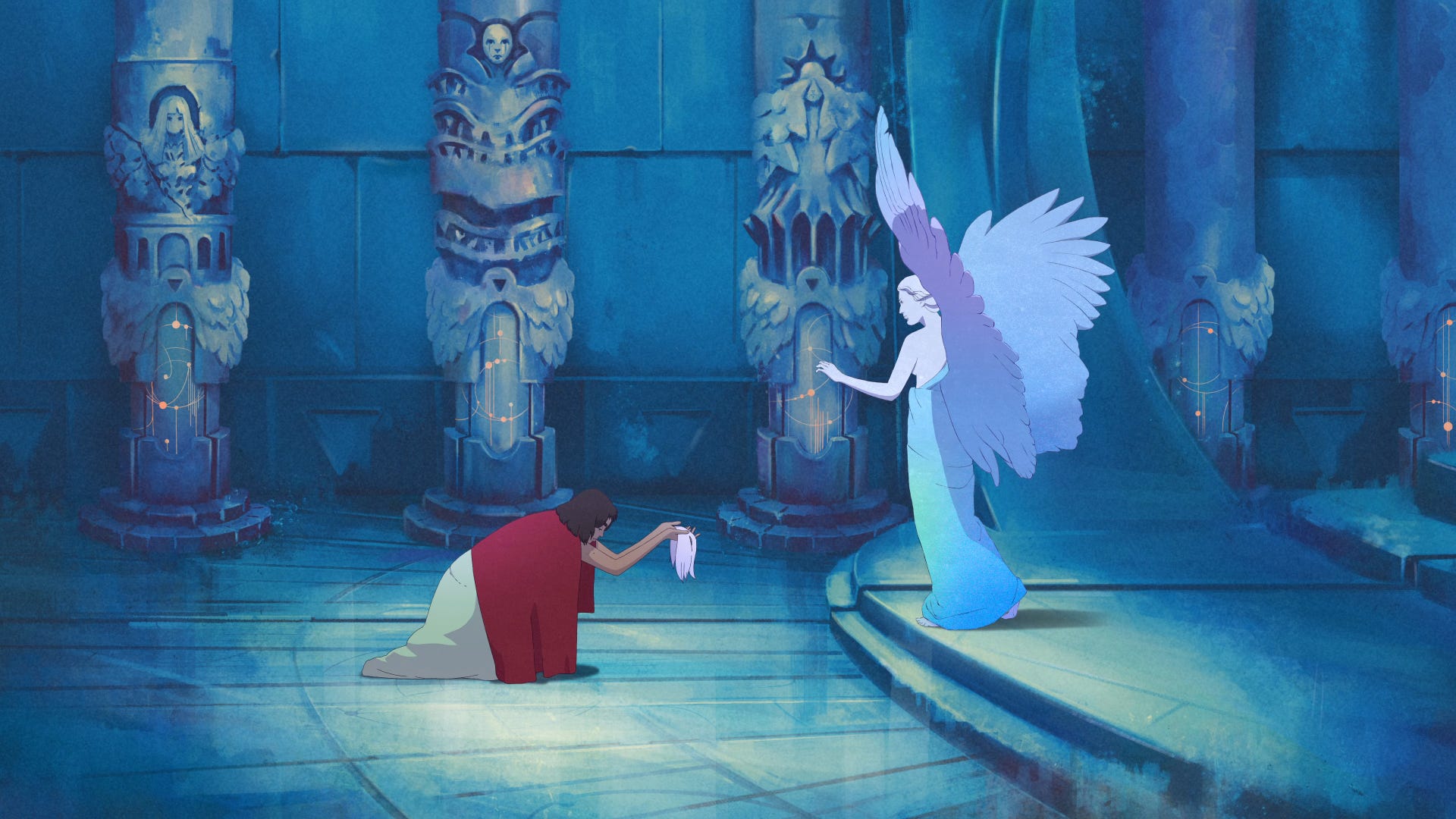 Her inspirations were mainly classical — “the dramatic forms of Caravaggio’s chiaroscuro, the vibrancy of Giovanni di Paolo’s illuminations for La Divina Commedia and the compositions of Eastern Orthodox iconography.” The villain’s look came from ancient Greek sculptures. Only the lead character is a contrast: Popescu wanted someone “very human” and out of place, with a scarf that creates “a more guarded, uncertain look … because she is always pulling it around herself, which closes her stance.”