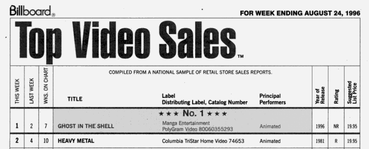 In August 1996, Ghost in the Shell set a record. It hit first place on Billboard’s weekly video sales chart, after placing in the top 40 for nearly two months. No anime film had topped that chart before — Manga had “struck gold,” according to Billboard. After five months, Ghost had sold 200,000 tapes just in America.14