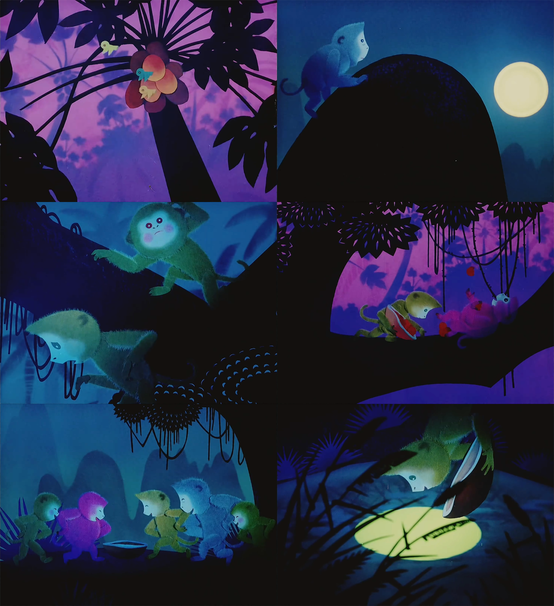 The technique lends the cast of Monkeys a furry, textured look unusual in cutout animation. It meant that they “glittered in the night,” wrote Ling Shu. Combined with A Da’s colorful designs, it’s a stunning visual — as seen in the full film below: