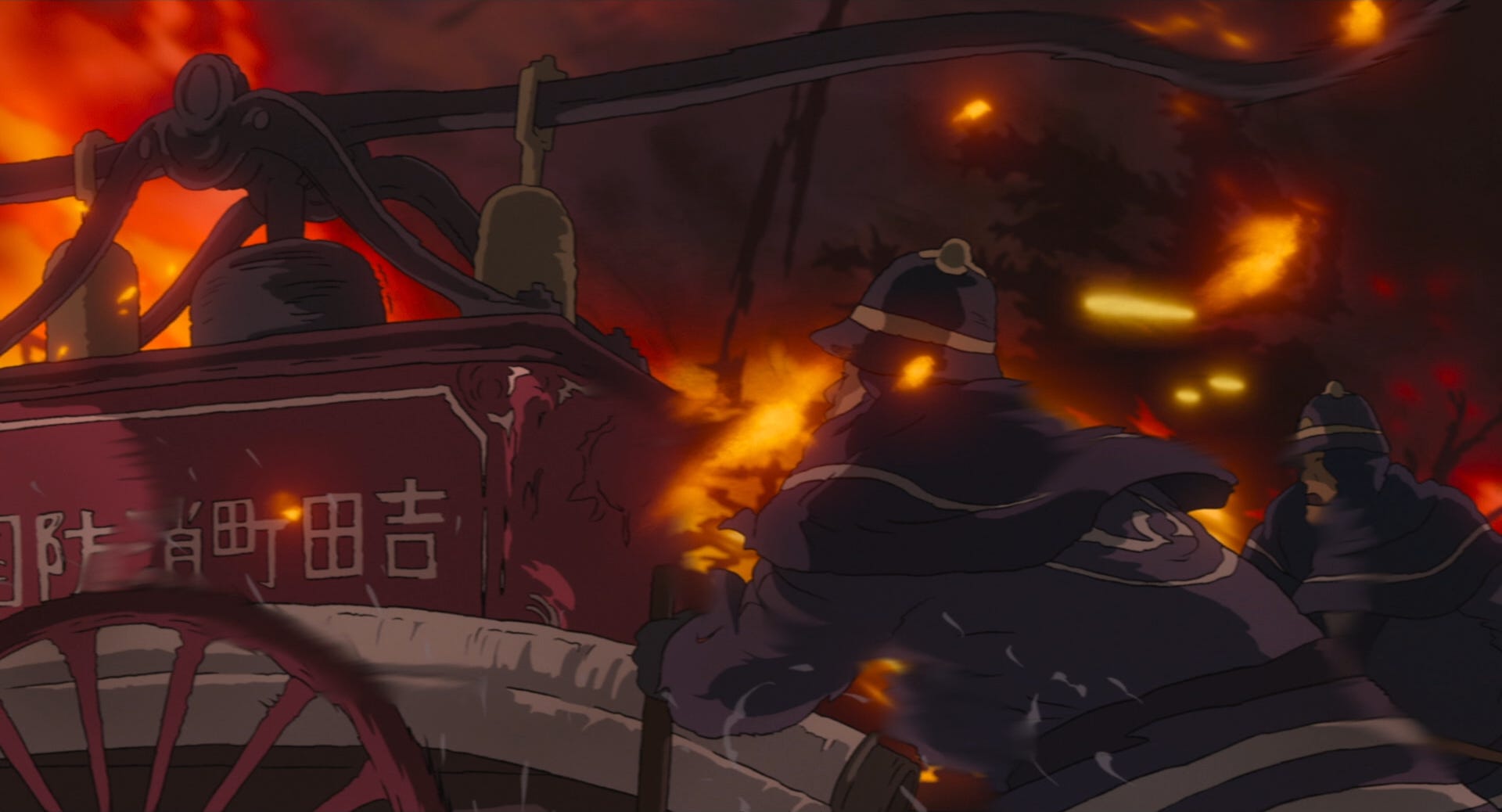 It’s there at the beginning. Tokyo is on fire. The lead character runs through its streets, and everything loses its shape — churning and thrashing. Bodies flicker like the flames around them. The wind looks strong enough to tear the screen to pieces.