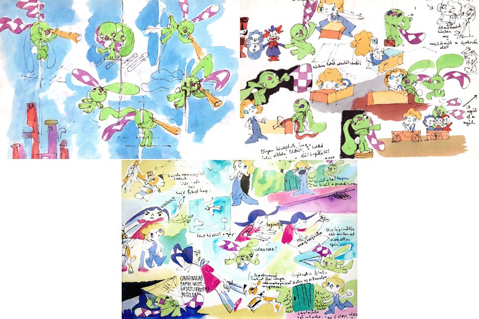 At that time, a manager from Hungarian Television asked Marék to submit a TV pitch. “The figure of the rabbit popped into my head,” she said — a character with oversized ears that it tripped over and dragged around. Eventually, the rabbit would learn that its ears allowed it to fly and help people. (“I didn’t know of Dumbo yet,” Marék noted.)