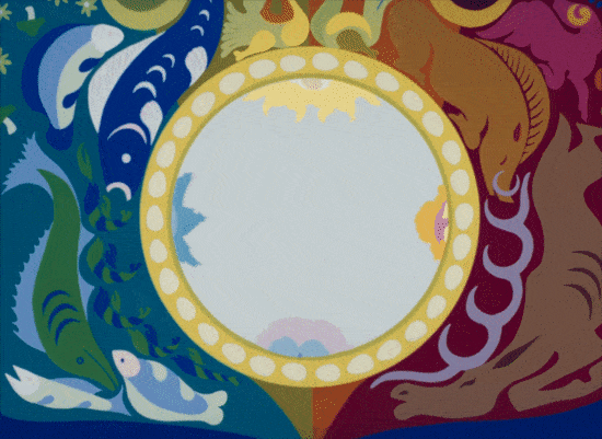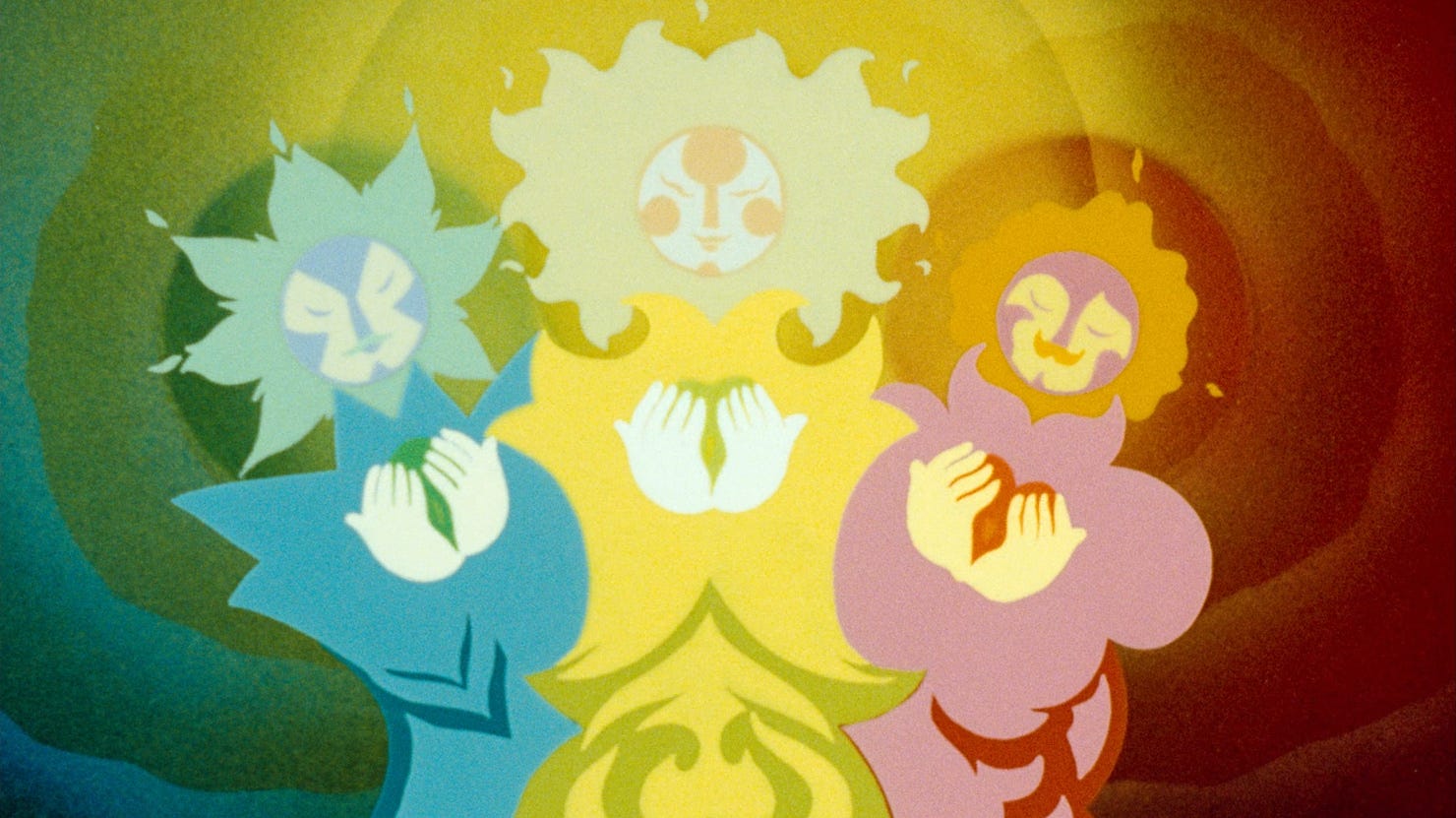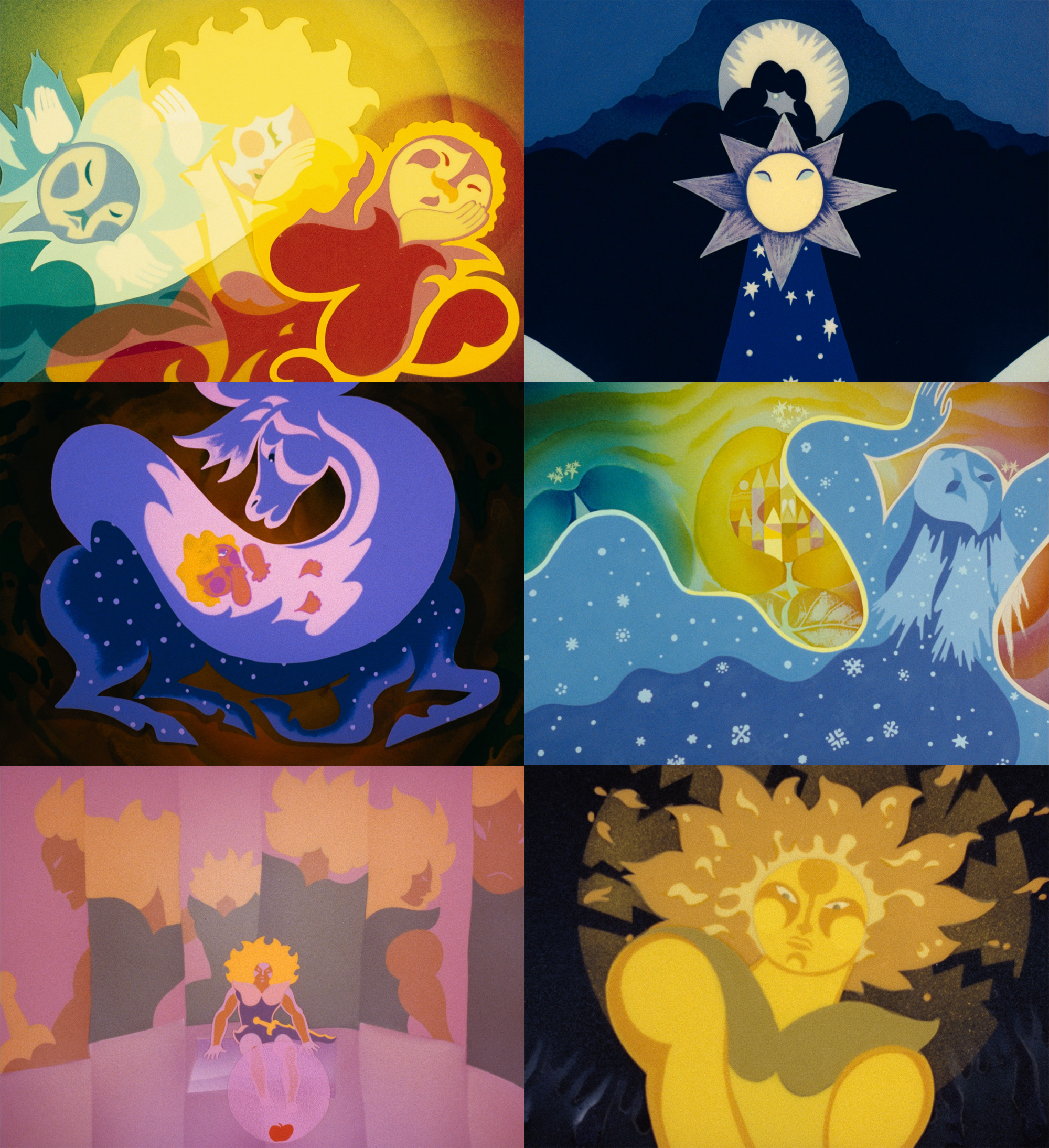 That was only part of it. Jankovics tended to be analytical, even scientific, in his work. He filled Son of the White Mare with the symbols and patterns he’d found while studying folklore and myth. The film’s intense color gradients, he said, came from Goethe’s Theory of Colors: “morning is green, yellow is noon, twilight is red, night is blue, with transitions.” And everything here rests on the idea of cycles — and circles.