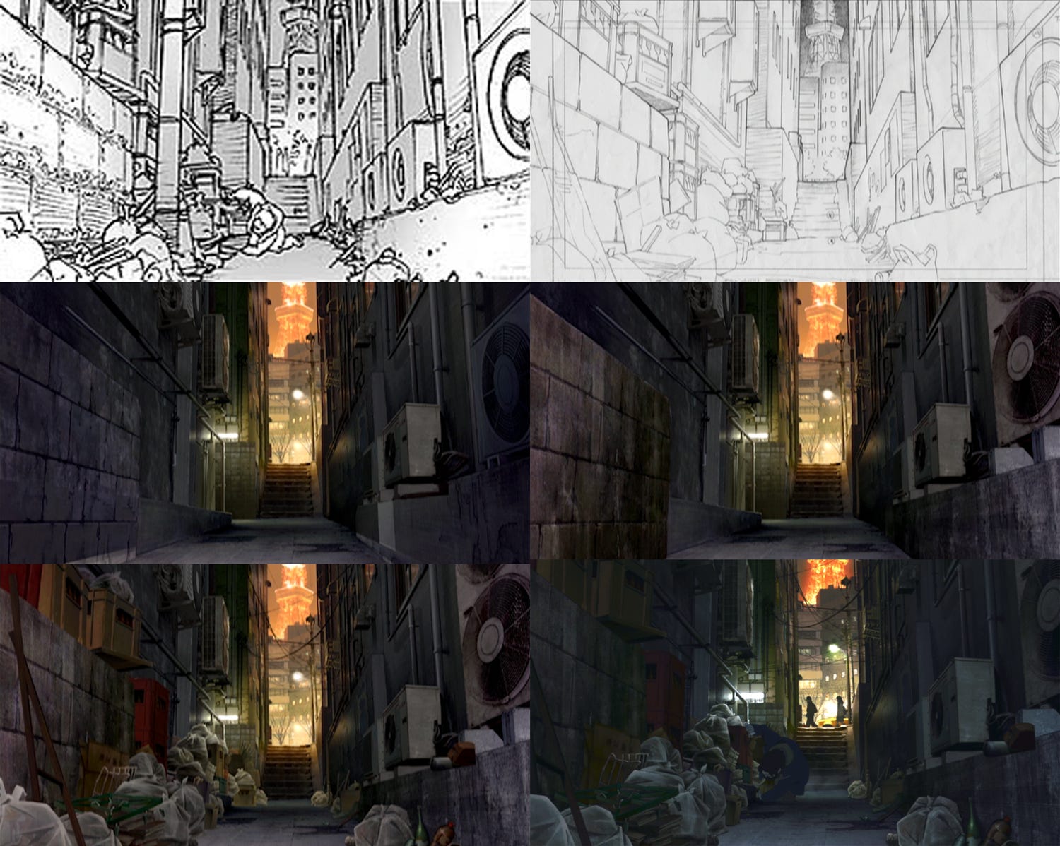 In fact, Kon saw it as fatal to copy the photographs too closely, even for locations based on real ones. The artists risked falling “into a labyrinth of details without grasping the essential composition and structure of the object.” The photorealism in Tokyo Godfathers was always added after a clear, simple, solid blueprint was in place.