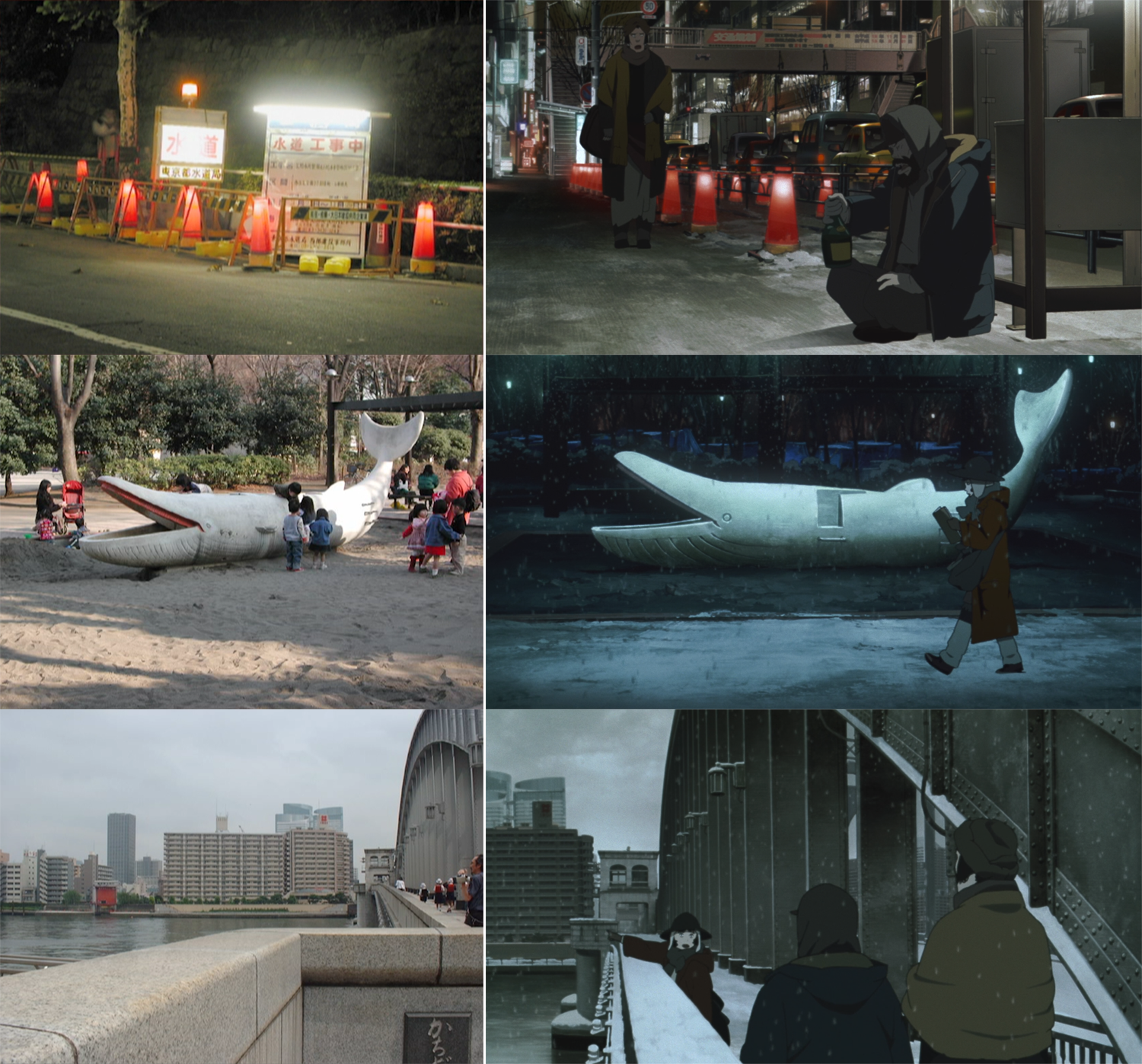 Real details and locations made their way into Tokyo Godfathers, but it wasn’t a matter of tracing photos. Most of the areas in the film, Kon wrote, were invented — just “likely places” based on their heaps of reference. Kon and his artists looked at their pictures, borrowed what they wanted and jammed disparate ideas together. They were building “places that feel like they could be in Tokyo.”