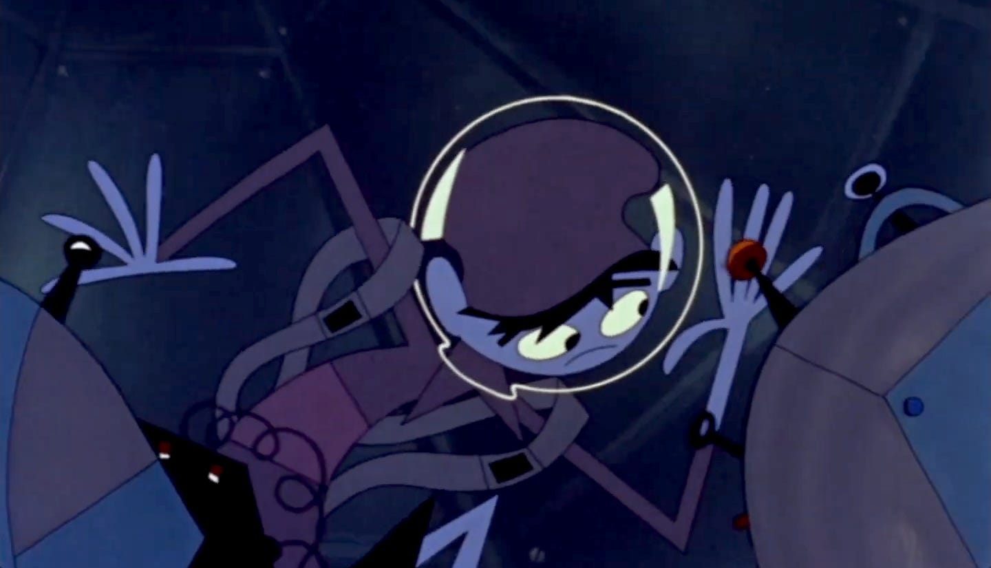 Even better than Ersatz, though, is Vukotić’s film Cow on the Moon (1959). In some ways, it feels like the Yugoslav precursor to Dexter’s Laboratory — only with Dexter as a girl and Dee Dee as a boy. The visual gags, like the moment when the scientist girl runs outside the film’s frame to tilt the background painting, are undeniable.