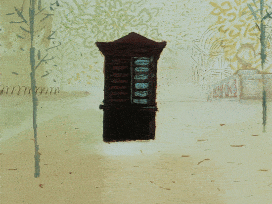 Because it was commissioned by the Guggenheim Museum and because they were dedicated to breakthrough art … [it] was mandatory to come up with a new technique in animation. We worked at ways of getting something that was never done and came up with this wax resist. … Take the animation, then we cover the drawing. Turn another piece of paper over and you take a wax candle, like a real paraffin, heavy paraffin and rub it very hard over that shape. And then you wash watercolor ink over it and what happens is you get a natural resist from the wax ... [We were getting] this wonderful texture on this thing and then double-exposing it over backgrounds that were also painted in the same technique … It’s like a painting coming to life.9