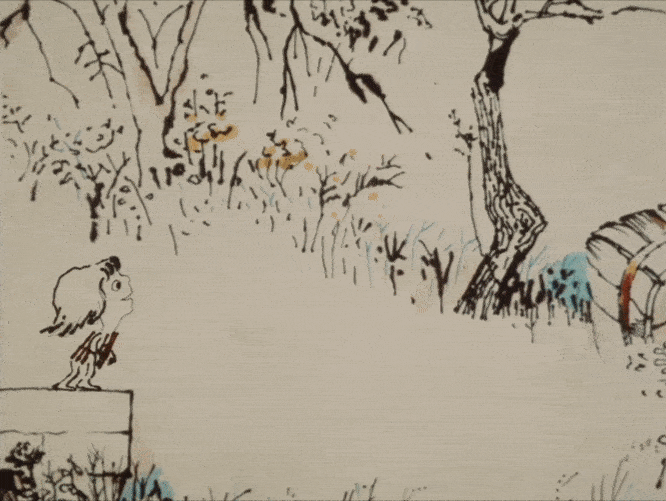 Third, the design and animation. The mask sections get away from Disney’s ideas: once again, it’s like painting in motion. And David’s animation isn’t literal or naturalistic — the characters act with human warmth, but they also transform in unreal ways. All of it was needed for the special “realism” that the film demanded. Like John Hubley wrote at the time: