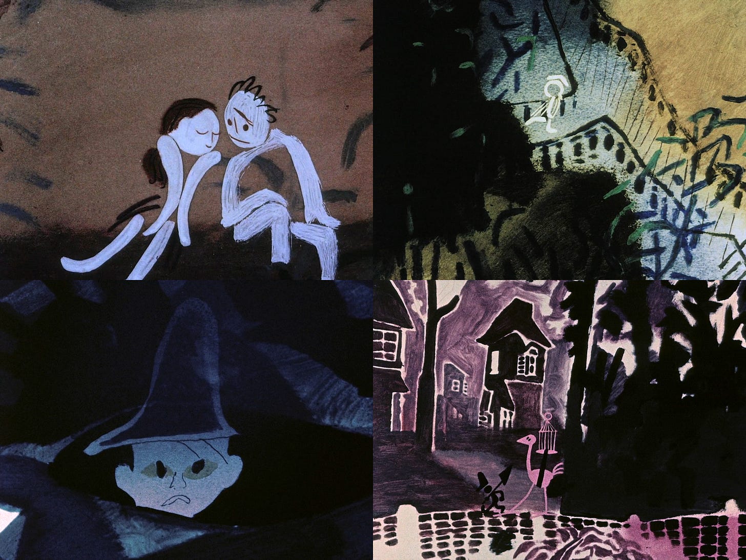 By the early ‘60s, Hubley films were known to those in the know, worldwide. Animators in the USSR looked at their experiments with a touch of envy. The painterliness of films like The Tender Game and Moonbird was a topic of discussion in places like Czechoslovakia and Yugoslavia. Disney was popular, but the Hubleys got the respect.16