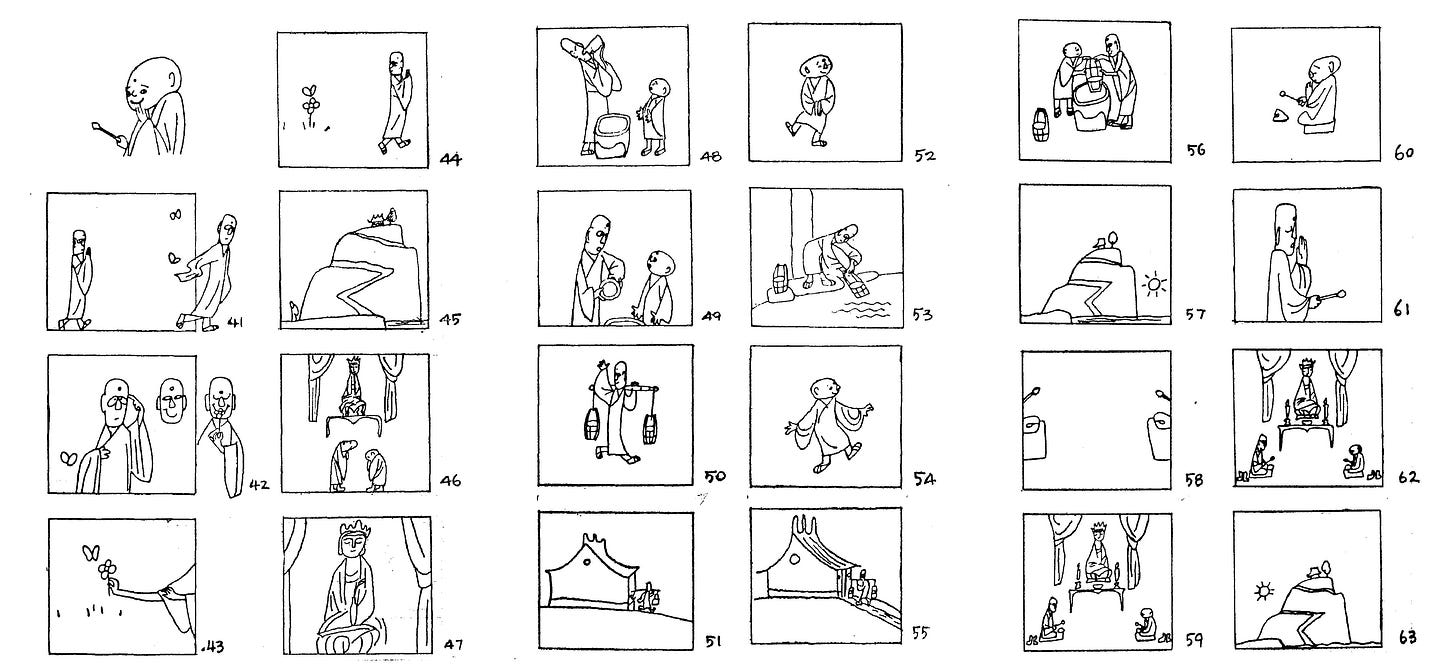 Cartoonist Han Yu came aboard to design the characters in his signature loose, freehand style. Meanwhile, A Da storyboarded the film by himself and choreographed each moment to fit the pre-recorded score, done in a traditional style. The master animator Ma Kexuan played a core role as well, drawing long sections of the film and polishing A Da’s choreography.