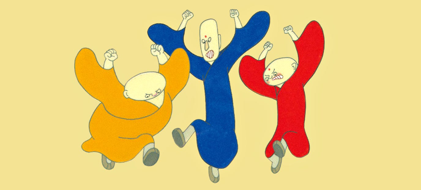 A Da subtly subverts the original proverb, though — and flips his film into a radical statement of protest. To Chinese audiences at the time, Three Monks was a clear plea for peace and unity, in the face of violence that the director and his co-workers had seen firsthand.