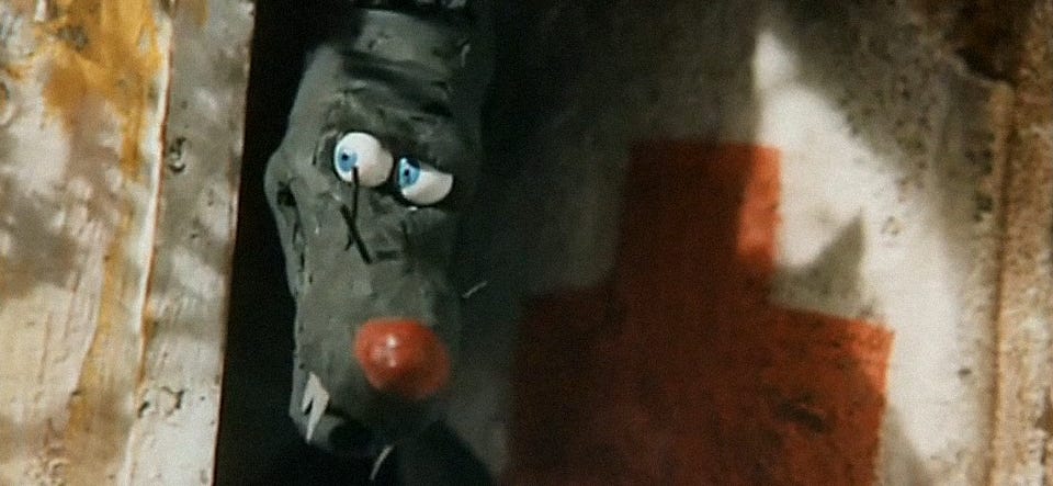 It all works even if you don’t know Russian history. The gags land on their own merits, from the Wolf’s stretchy leg in Aybolit’s office to Red Riding Hood’s twirl into the dirt. The clay animation and especially the camerawork are wildly inventive — even newer clay films rarely make the camera feel so physically present in the scene. The weird perspectives and occasional fisheye lens feel influenced by Brazil and other then-new Terry Gilliam projects.