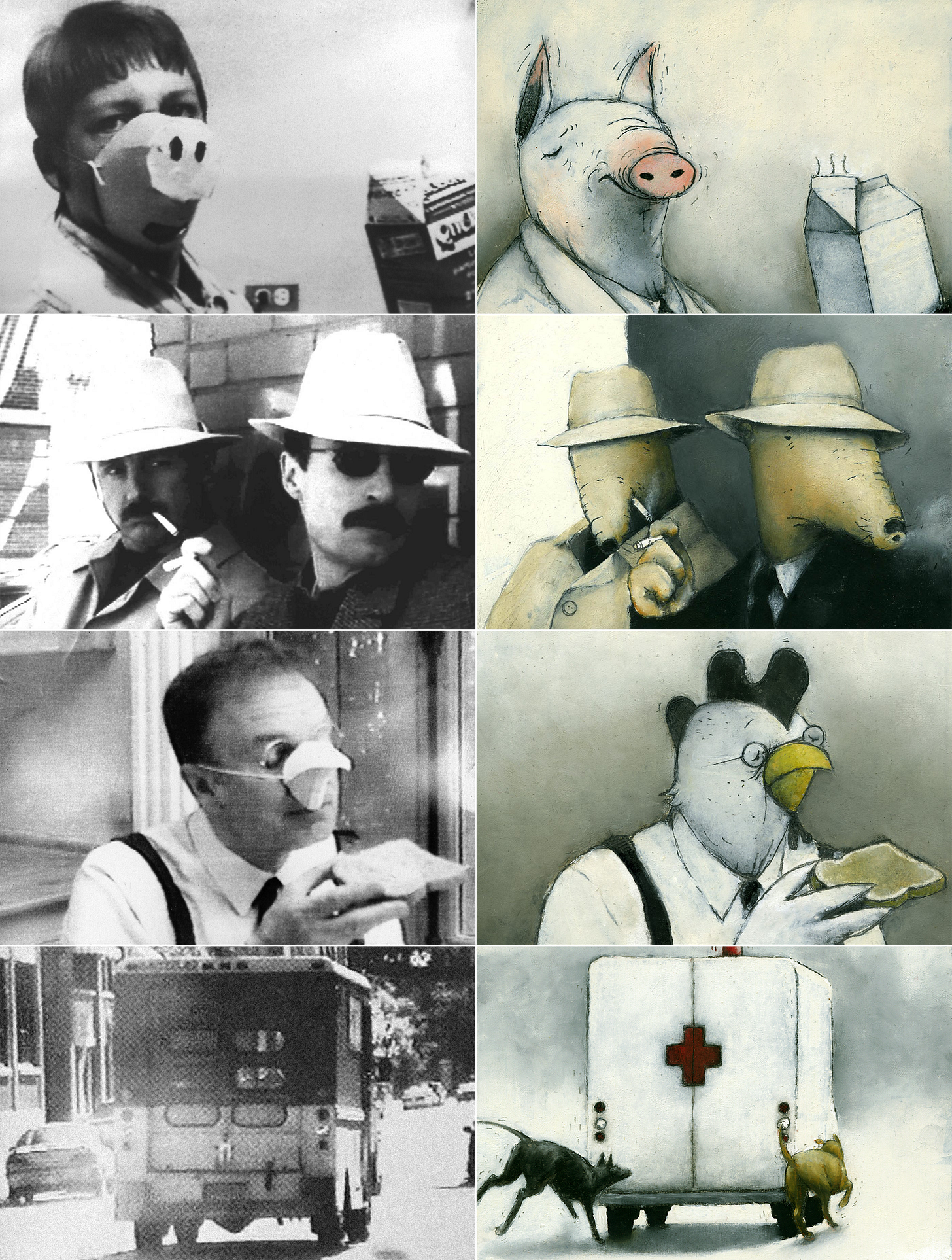 First we shot live action on a High 8 video camera (nothing fancy). We used our friends or ourselves as actors to get the basic movement without worrying too much about the aesthetics of the video. Then we went back to the studio and selectively printed out frames of the action using a video printer, which creates small 4x3 thermal black and white prints. We usually manipulated the action, speeding it up, slowing it down or sometimes reversing the order. After that we photocopied the whole shot and painted over the action using oil sticks and pencil, turning humans into animals.